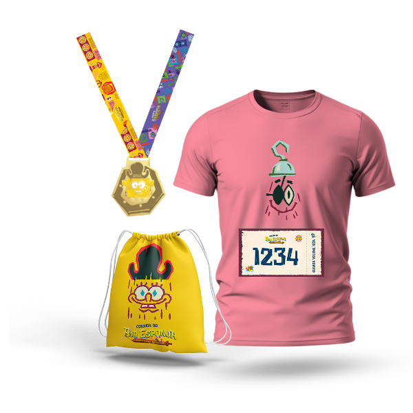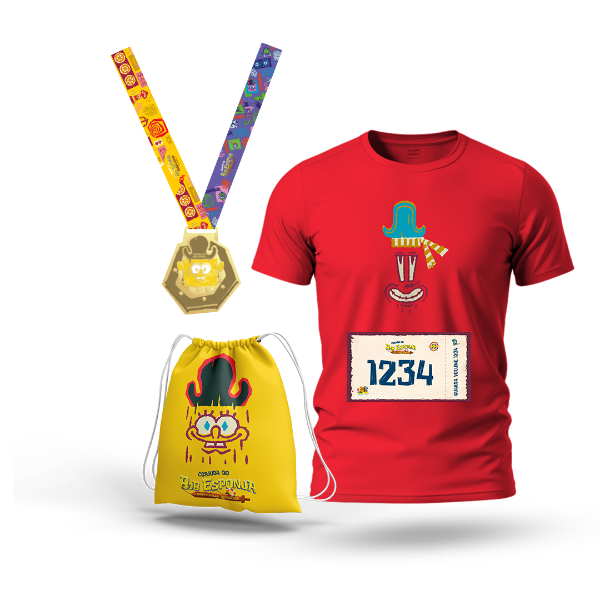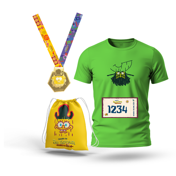 Kit Sr. Sirigueijo: camisa do Sr. Sirigueijo, medalha, número de peito e sacochila.