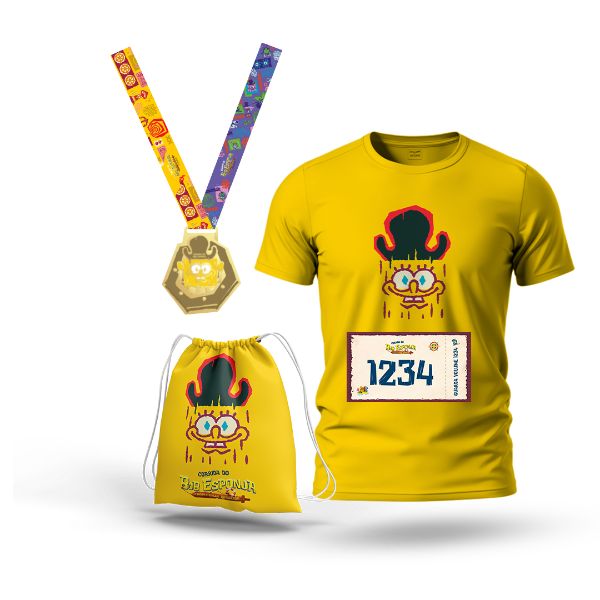 Kit Bob Esponja Calça Quadrada: camisa do Bob Esponja, medalha, número de peito e sacochila.