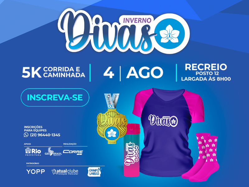 O Evento Esportivo DIVAS RUN INVERNO será realizado no Recreio dos Bandeirantes com largada e chegada no Posto 12, no dia 04 de agosto de 2024, em qualquer condição climática. O evento é exclusivo para mulheres devidamente inscritas, promovendo a prática de atividade física e o espírito de comunidade.