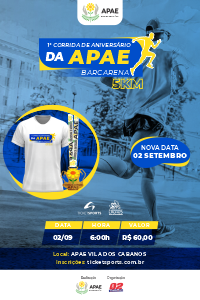 A Prova Pedestre CORRIDA DE RUA 1ª ANIVERSÁRIO DA APAE BARCARENA - PA, será realizada no dia 02 DE SETEMBRO DE 2023 a partir das 06:00h, em Barcarena na VILA DOS CABANOS, com distância de 05 Km, por PESSOAS DE TODOS OS SEXOS devidamente inscritas, independentemente da condição climática.
