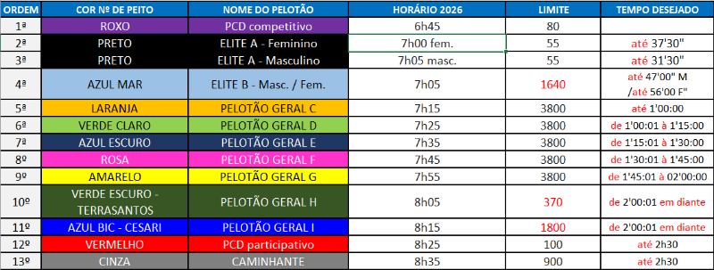 No momento da inscrição, o atleta deverá selecionar seu horário de largada com base na sua intenção de tempo total para completar a corrida ou caminhada, garantindo uma melhor organização e fluxo durante o Evento.