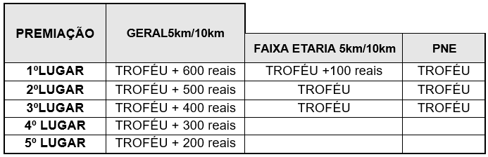 6.2. Serão premiados com troféus os cinco primeiros colocados no masculino e feminino geral e os cinco primeiros colocados no masculino e feminino de cada categoria de acordo com o quadro abaixo: