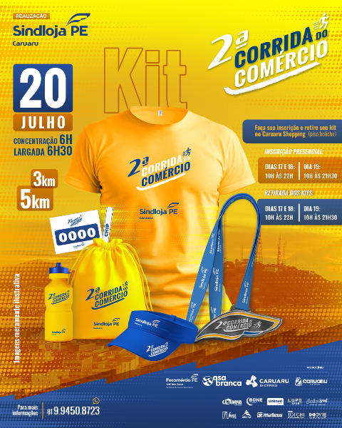 A retirada dos kits será nos dias 18 e 19 de julho, das 10h às 22h, na Av. Adjar da Silva Casé, 800 – Indianópolis – Caruaru-PE. É necessário apresentar documento de identidade, comprovante de inscrição e 1kg de alimento não perecível. Não haverá entrega de kits no dia da prova.