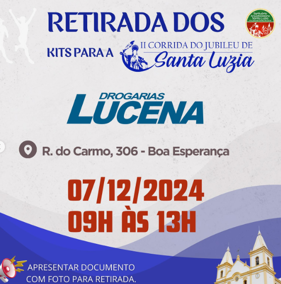 Organização: O EVENTO é realizado pelo Santuário Arquidiocesano de Santa Luzia com o apoio das Adms do grupo de corrida Friends Who Love Running de Santa Luzia.
