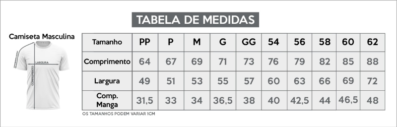 Tabela de medidas, para saber o tamanho da sua camiseta.