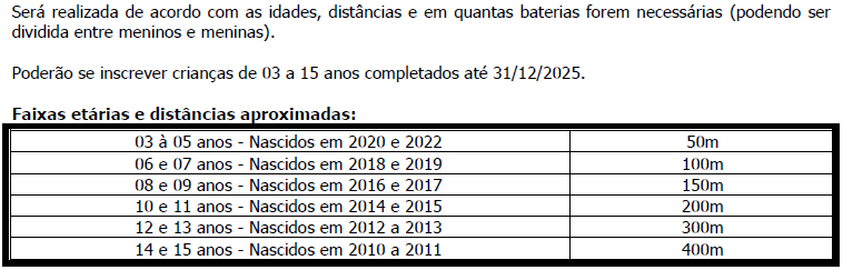 Corrida Kids: percursos de 50 a 400 metros. (Informações específicas no Regulamento do evento).