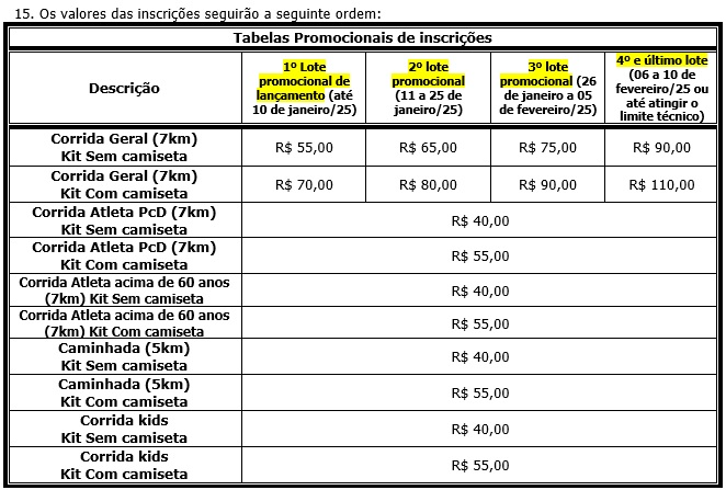 O valor da inscrição para corredores acima de 60 anos (conforme o Estatuto do Idoso), atletas PcD, caminhada ou corrida kids, já possuem os 50% descontos, conforme tabela acima.