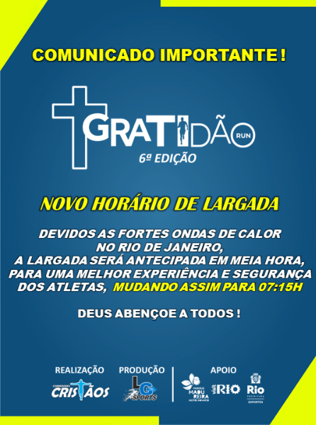 A 6ª Edição da Corrida e Caminhada GRATIDÃO RUN SOLIDÁRIA faz parte do Circuito Solidário Corredores Cristãos, VAMOS COMEÇAR O ANO DA MELHOR FORMA ! AGRADECENDO A DEUS PELAS BENÇÃO QUE VIRÃO E FAZENDO O BEM AO PRÓXIMO. O evento será realizado no dia 20/01/2024 FERIADO, pelo Grupo Corredores e produção da LG SPORTS no Parque Madureira, com concentração na frente dos Arcos Olímpicos ao lado do prédio da administração, fica próximo ao Portão 03 - Endereço: Rua Manoel Marques esquina com a Rua Pirapora 195. com largada as 07:45h para Corrida e Caminhada de 4KM. ( COM PREMIAÇÃO GERAL E FAIXAS ETÁRIAS )