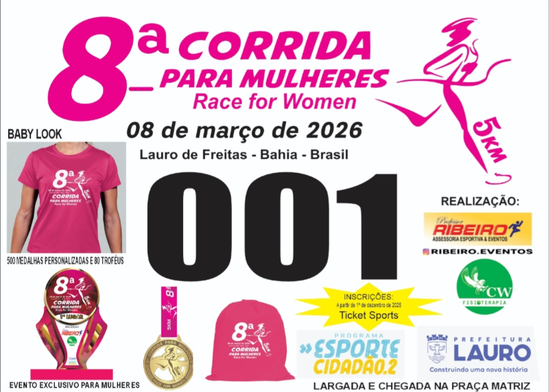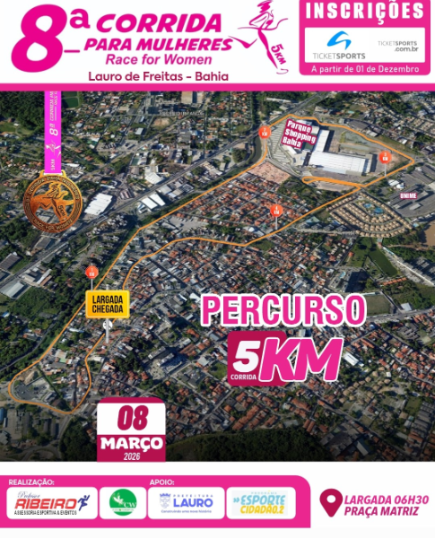 A 8ª edição da Corrida Para Mulheres acontece no dia 8 de março de 2026 (domingo), com largada às 6h30 na Praça da Matriz, em Lauro de Freitas (BA). Um evento exclusivo para mulheres a partir de 16 anos, com percurso de 5km e diversas premiações. Uma celebração ao Dia Internacional da Mulher com estrutura completa, animação e segurança para todas! 🌸👟