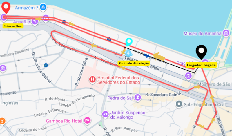 *No circuito de 3 KM, o atleta deverá caminhar até a roda gigante e voltar pela orla até a chegada no Museu do Amanhã.