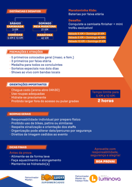 🏆 Premiação para os 5 primeiros colocados nas distâncias de 5km, 10km, 21km e 42km (masc/fem) com troféus.