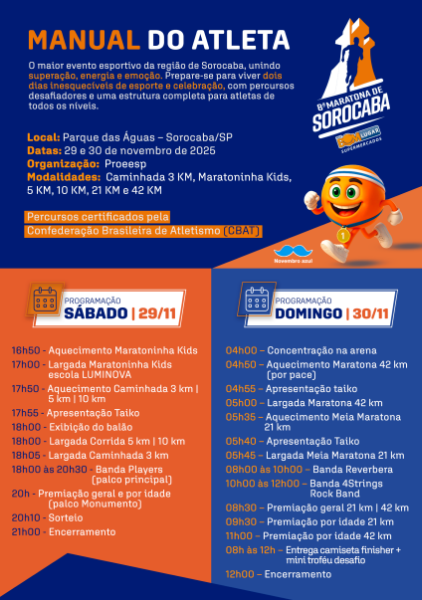 📍 Local: Parque das Águas – Sorocaba/SP📅 Datas: 29 e 30 de novembro de 2025🏁 Prova oficial com percursos aferidos pela CBAT, válida como qualificatória para a Maratona de Boston e Comrades Marathon. A maior e mais plana maratona do Estado de São Paulo, promovendo superação, energia e emoção.