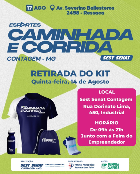 O Circuito Sest Senat de corrida e caminhada de rua será realizada no dia 17 de agosto de 2025, com largada e chegada na Av. Severino Ballesteros, 2498 – Ressaca, Em Frente ao Shopping Contagem em Contagem Minas Gerais.