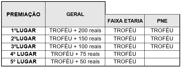 6.2. Serão premiados com troféus os cinco primeiros colocados no masculino e feminino geral e os cinco primeiros colocados no masculino e feminino de cada categoria de acordo com o quadro abaixo: