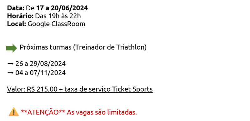 CURSO DE TREINADOR BRASIL TRIATHLON 2024 CBTRI 17 a 20/06/2024 Google Classroom: Brasil INSCRIÇÕES: PROGRAMA DE CAPACITAÇÃO TÉCNICA VIRTUAL: Programa de Capacitação Técnica Virtual CBTri - Curso de Treinador de Triathlon.pdf CALENDÁRIO DE CURSOS 2024 CONTATO: COMPARTILHE ESTE EVENTO Organizador CBTRI