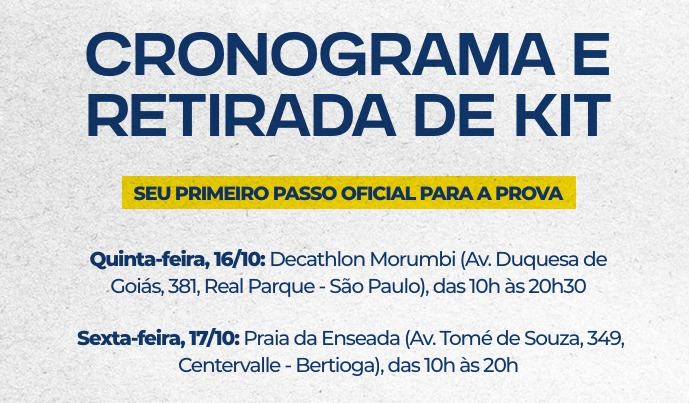 Kit BM: Formado por camiseta, sacola, copo, chip de cronometragem, número de peito e medalha pós prova;