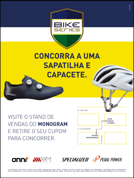 Como concorrer ao sorteio de um Capacete Specialized S-Works Prevail 3 e a uma Sapatilha S-Works Torch oferecidos pela Pedal Power/Specialized e Monogram durante o Bike Series São Paulo.