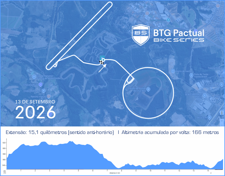 Cada pedalada conta uma história. No dia 13 de setembro de 2026, o BTG Pactual Bike Series convida você a viver uma experiência marcante no Campo de Provas Cruz Alta (GM), em Indaiatuba-SP. Um percurso desafiador, um ambiente único e a energia de quem ama o ciclismo serão o cenário para você superar desafios e celebrar cada conquista sobre duas rodas. Prepare-se para sentir, evoluir e se orgulhar de cruzar a linha de chegada.