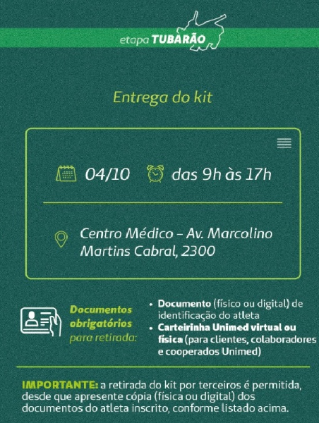 • Atletas que residam fora da cidade da prova poderão retirar-se no dia do evento, com apresentação de comprovante de residência.