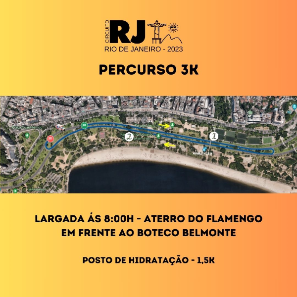 1.1) O Evento Esportivo "3ª ETAPA DO CIRCUITO RJ 3K, 5K E 10K", doravante denominada EVENTO, será realizado no ATERRO DO FLAMENGO com largada e chegada em frente a PRAÇA CUAUHTEMOC, no dia 07 de Setembro de 2023 em qualquer condição climática, com participação de pessoas, homens e mulheres devidamente inscritos, doravante denominadas ATLETAS.