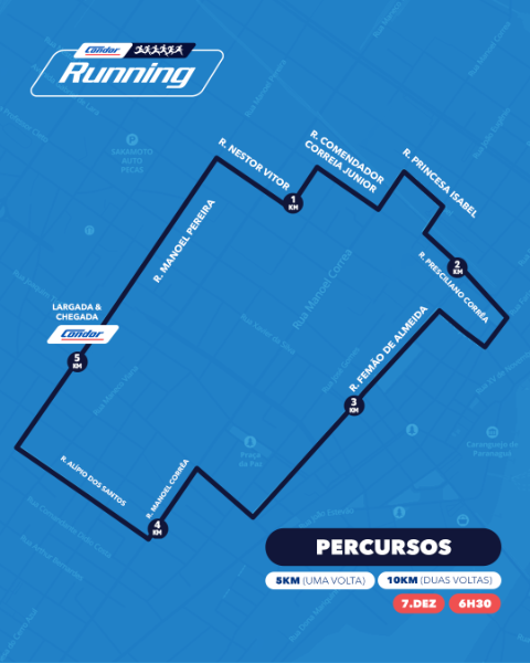 O percurso total é de 10km (corrida), 5km (corrida) e 5 km (caminhada), poderá ter variações nas distâncias.