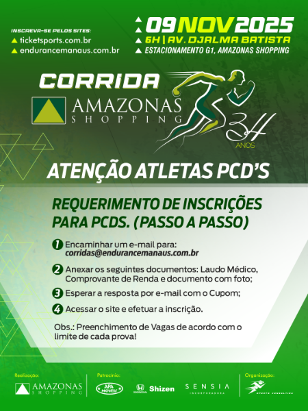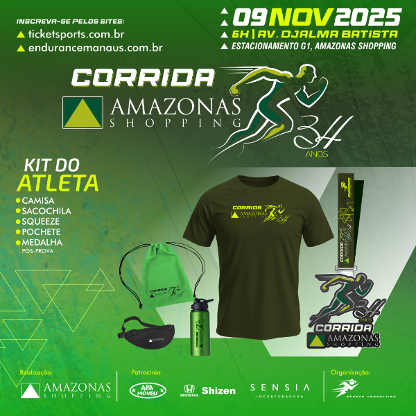 A Corrida Amazonas Shopping 34 anos 2025 será realizada no domingo, 09 de novembro de 2025, às 6h, no Estacionamento G1 do Amazonas Shopping, na cidade de Manaus/AM.
