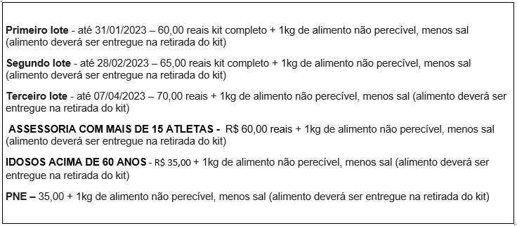 • Na retirada do kit o atleta deverá apresentar documentação oficial com foto.