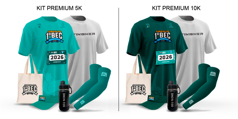 Kit Premium – Esse kit contempla todos os itens do kit completo com os adicionais: camiseta finish, manguito, e garrafa térmica.