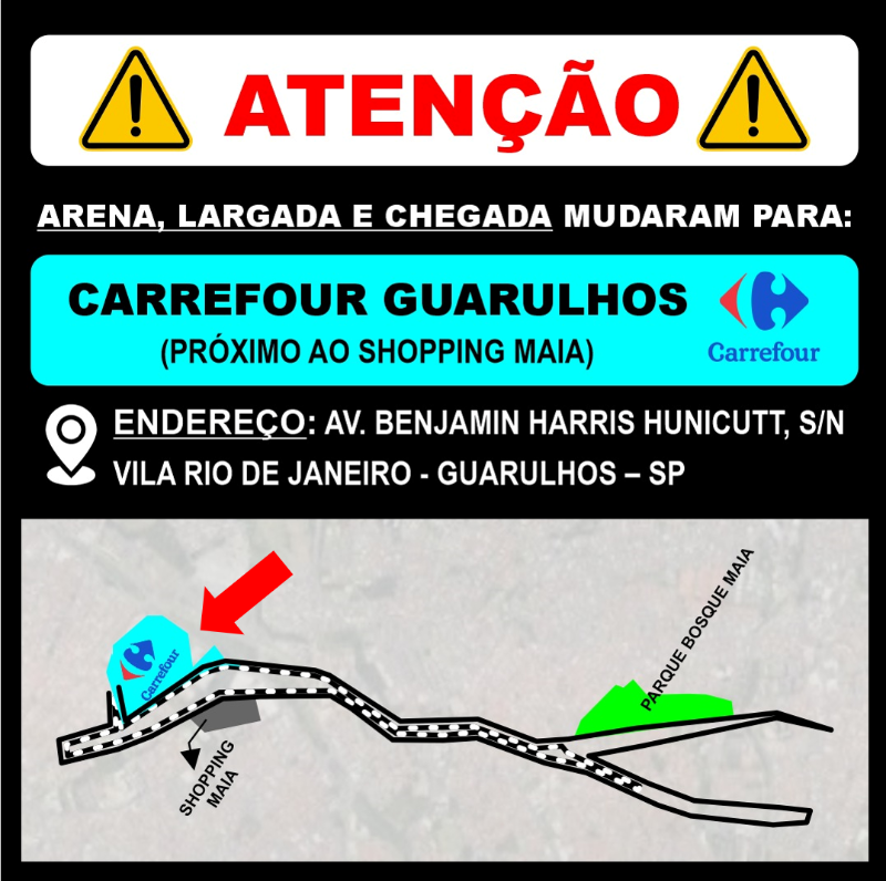 A corrida ocorrerá nas distâncias de 5km, 10km e 15km, a caminhada na distância de 5km, com a LARGADA e CHEGADA no ESTACIONAMENTO DO CARREFOUR