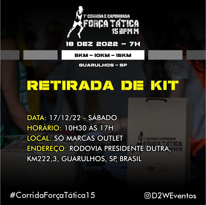 A CORRIDA E CAMINHADA FORÇA TÁTICA – 15º BPM/M, doravante denominada EVENTO, será realizada às 7h do dia 18 DE DEZEMBRO DE 2022 (DOMINGO), na cidade de GUARULHOS – SP, no CARREFOUR GUARULHOS (ENDEREÇO: AV. BENJAMIN HARRIS HUNICUTT, S/N – VILA RIO DE JANEIRO - GUARULHOS – SP - PRÓXIMO AO SHOPPING MAIA, com a largada e chegada dentro do ESTACIONAMENTO DO CARREFOUR, que ocorrerá sob qualquer condição climática, com a participação de pessoas de ambos os sexos, devidamente inscritas, doravante denominados ATLETAS.
