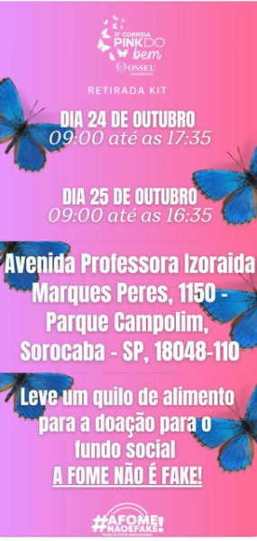 Pelo décimo primeiro ano seguinte a edição da CORRIDA PINK DO BEM - OSSEL ASSISTÊNCIA, é realizada no mês de outubro para divulgar a importância da prevenção do câncer de mama e arrecadar renda para exames de biópsias das mulheres que estão aguardando na fila do SUS.