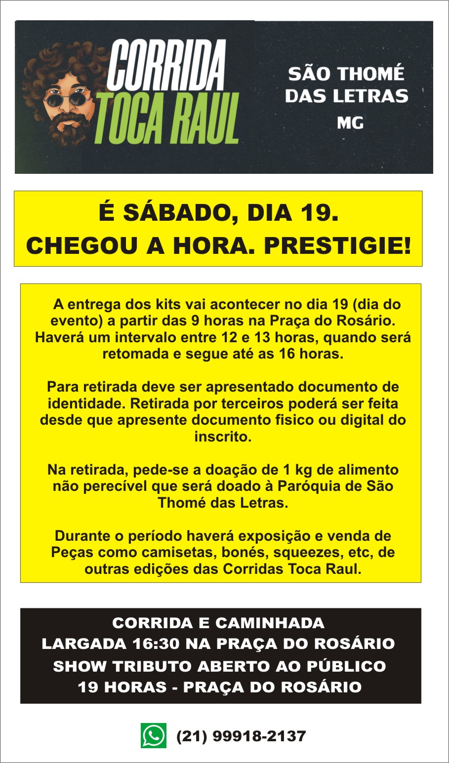 CORRIDA TOCA RAUL SÃO THOMÉ DAS LETRAS 2025 Atenas Projetos Esportivos 19/07/2025 Praça do Rosário: Praça do Rosário, s/n, São Thomé das Letras, MG, Brasil REGULAMENTO REGULAMENTO TICKET - CORRIDA TOCA RAUL SÃO THOMÉ 2025.pdf RETIRADA DE KIT COMPARTILHE ESTE EVENTO Organizador Atenas Projetos Esportivos CNPJ: 60.018.132/0001-72