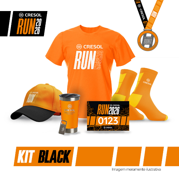 Kit do Atleta – BLACK - Sacola, camiseta do evento, boné, copo térmico 500ml, meia de poliamida, medalha de participação e número de peito.
