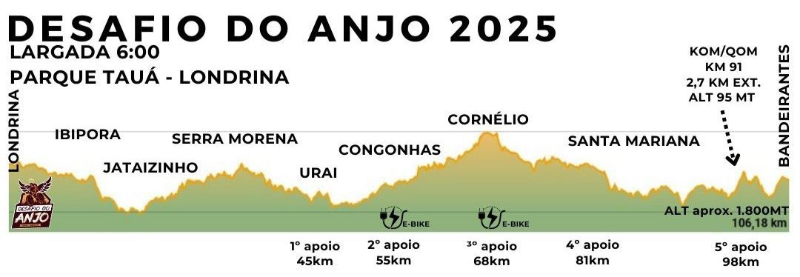 O Desafio do Anjo será realizado no dia 23 de agosto, com largada às 6h00 no Parque Tauá (Parque Tauá - Av. dos Pioneiros, Km 6 - S/n - Abussafe) e chegada no Santuário São Miguel Arcanjo em Bandeirantes, BR369 KM58.