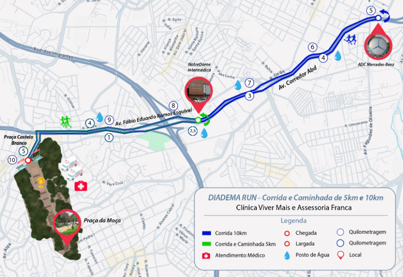 O Evento Esportivo DIADEMA RUN, prova pedestre, com participação de ambos os sexos, será realizado no dia 14 de abril de 2024, domingo, na Praça da Moça, Centro de Diadema.