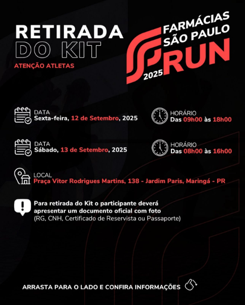 A prova rústica FARMÁCIAS SÃO PAULO, será realizada no dia 14 de setembro de 2025, na cidade de Maringá – PR, com distâncias de 4.000 e 8.000 metros, independentemente da condição climática, por participantes de ambos os sexos devidamente inscritos.