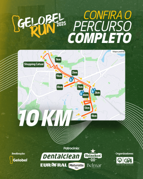 A Gelobel Run 2025 será realizada no dia 28 de setembro, com largada e chegada no estacionamento externo do Catuai Londrina Shopping, Rodovia Celso Garcia Cid 5600 e percurso na marginal da PR 445.