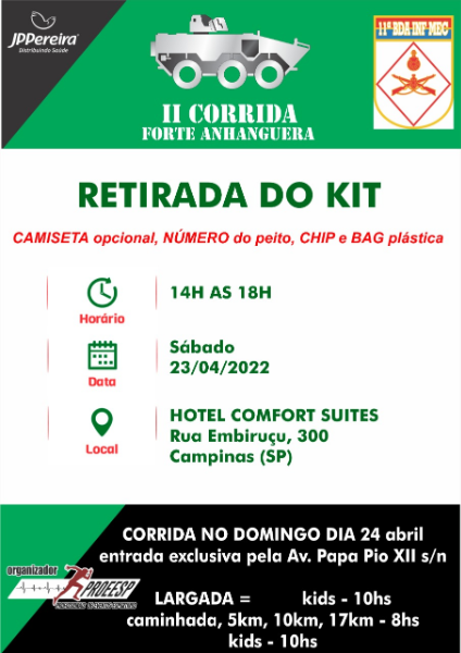 - A CORRIDA FORTE ANHANGUERA - Exército, será realizada sua na cidade de Campinas (SP) no dia 24 abril de 2022, sob qualquer que seja a condição climática, com participação de PESSOAS DE AMBOS OS SEXOS, devidamente inscritas, doravante denominadas ATLETAS.