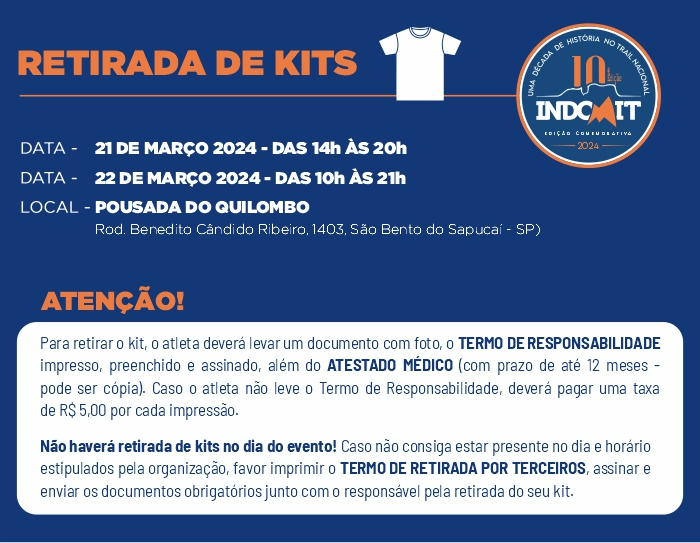 Clique AQUI e acesse o TERMO DE RESPONSABILIDADE, imprima e leve assinado para a retirada de seu kit.
