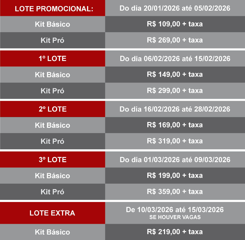 - PRO: Numeral / Chip / Medalha / Bolsa / Boné / Camisa casual