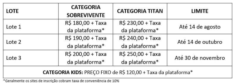 - Observação: a categoria kids contará com monitores dedicados e alguns obstáculos exclusivos.