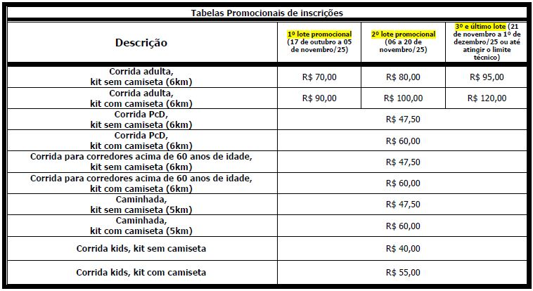 O valor da inscrição para corredores acima de 60 anos (conforme o Estatuto do Idoso), atletas PcD, caminhada ou corrida kids, já possuem os 50% descontos, conforme tabela acima.