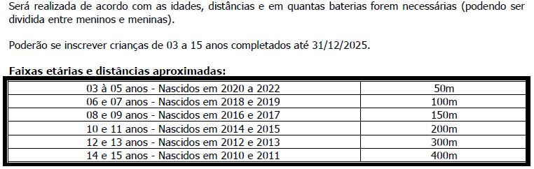 Corrida Kids: percursos de 50 a 400 metros. (Informações específicas no Regulamento do evento e mais abaixo).