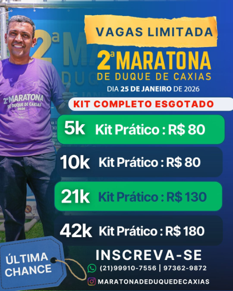 🌟 Um dos maiores eventos de corrida da Baixada Fluminense, com estrutura profissional, ambiente familiar e muita animação. Celebre a saúde, o esporte e a superação pessoal em um percurso vibrante pelas ruas de Duque de Caxias.📲 Acompanhe todas as novidades e atualizações do evento pelo Instagram: @maratonaoficialduquedecaxias. Atendimento também pelo WhatsApp: (21) 96750-9523 e e-mail: [email protected].