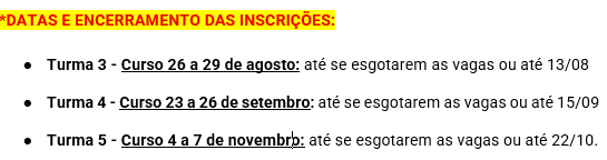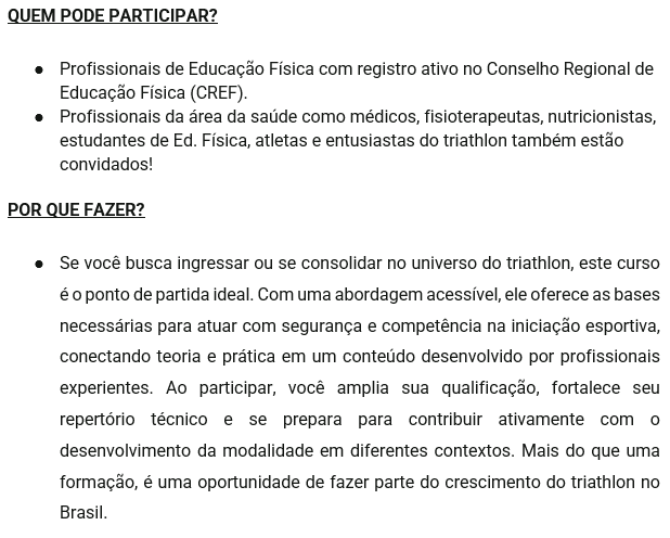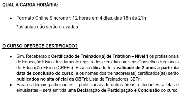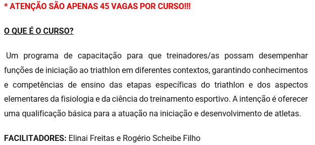 OFERTAS PRÓXIMOS CURSOS DE TREINADORES BRASIL TRIATHLON 2025 CBTRI 26 a 29/08 | 23 a 26/09 | 04 a 07/11 Google Classroom: Brasil CURSO - CERTIFICAÇÃO DE TREINADORES/AS DE TRIATHLON NÍVEL 1 - CBTRI LINK: CURSO EXCLUSIVO TREINADORASPARA MAIORES DETALHES DO PROGRAMA DE CERTIFICAÇÃO DE TREINADORES, CLIQUE NO LINK ABAIXO:Curso Treinadores (as) nível 1 - 2025.pdf INSCRIÇÕES: CONTATO: COMPARTILHE ESTE EVENTO Organizador CBTRI