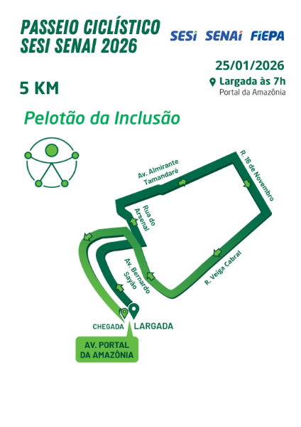 Pessoas com Deficiência poderão participar do evento gratuitamente. O participante deve solicitar a cortesia e enviar um Atestado Médico com o CID e um documento oficial com foto, com prazo de validade de até 1 ano antes da data do evento, ou o Cartão PcD para o e-mail [email protected]. Após esse contato, a organização irá emitir o desconto de 100% exclusivo para o participante. O mesmo deve realizar sua inscrição pelo site, no campo do Pelotão da Inclusão. As Vagas disponíveis são em até o limite de 5% do total de vagas do Passeio Ciclístico SESI SENAI 2026