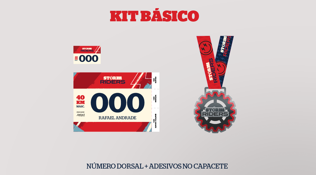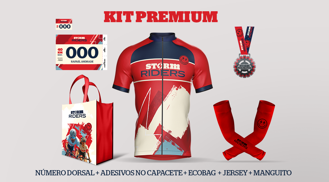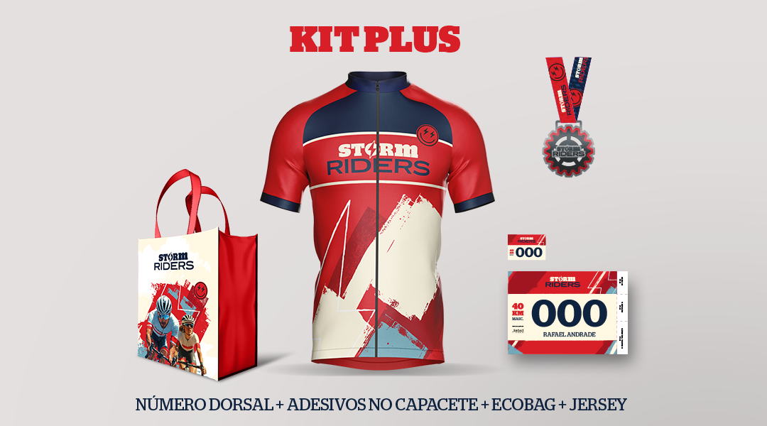 Inscrição + número no dorsal + adesivo no capacete + medalha de participação + ecobag + jersey + manguito
