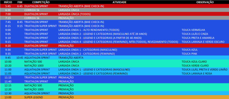 Largadas Triathlon Super Sprint: 09:30 (consultar programação)