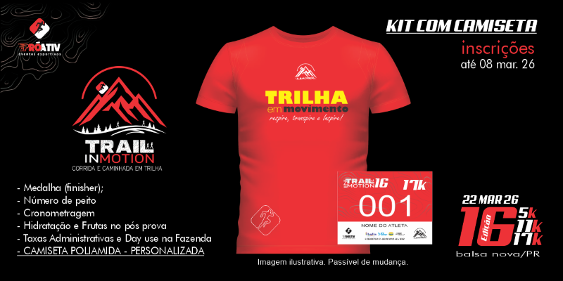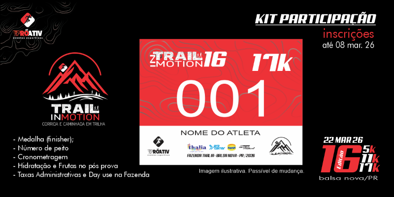 Venha com a Pro-Ativ Eventos Esportivos movimentar trilhas nesta 16ª Edição da TRAIL IN MOTION. Aqui você pode correr e caminhar, interagindo com centenas de pessoas, com a natureza, e com novos desafios que irão lhe trazer muita aventura, e muita diversão. Acreditamos que você irá cansar, sentirá diferentes emoções, e certamente ficará ansioso para participar da próxima ;)
