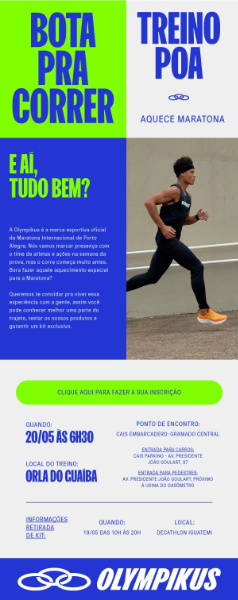 A Olympikus é a marca esportiva oficial da Maratona Internacional de Porto Alegre. Nós vamos marcar presença com o time de atletas e ações na semana da prova, mas o corre começa muito antes. Bora fazer aquele aquecimento especial para a Maratona?